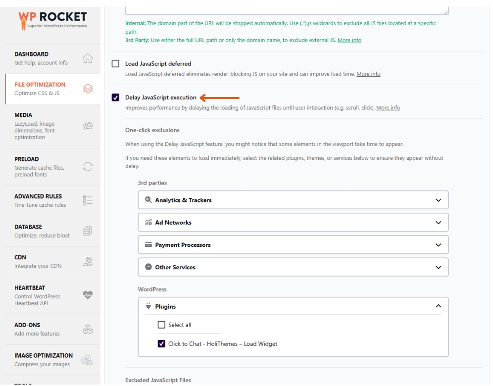 • Navigate to Settings > WP Rocket > File Optimization > Delay JavaScript Execution.