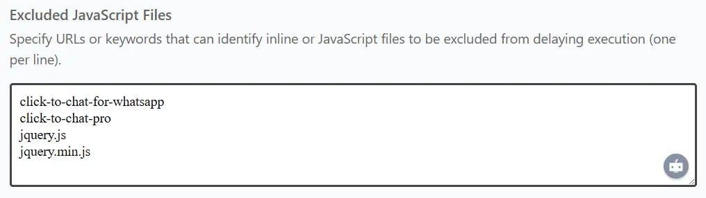 • If the Click to Chat plugin is not available in the selection list, you can still enable this by manually adding the plugin’s JavaScript files or related keywords to the Excluded JavaScript Files section.