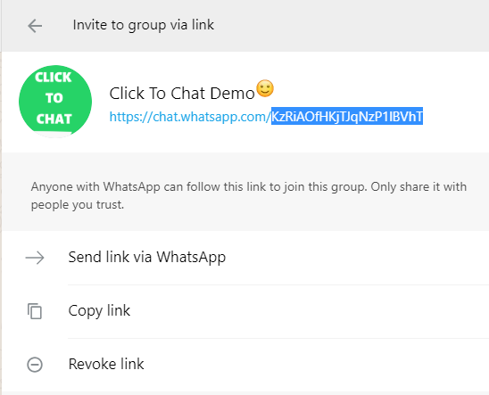 Add this Id on the settings page of your Click to chat plugin under the Whatsapp Group Id and save the changes