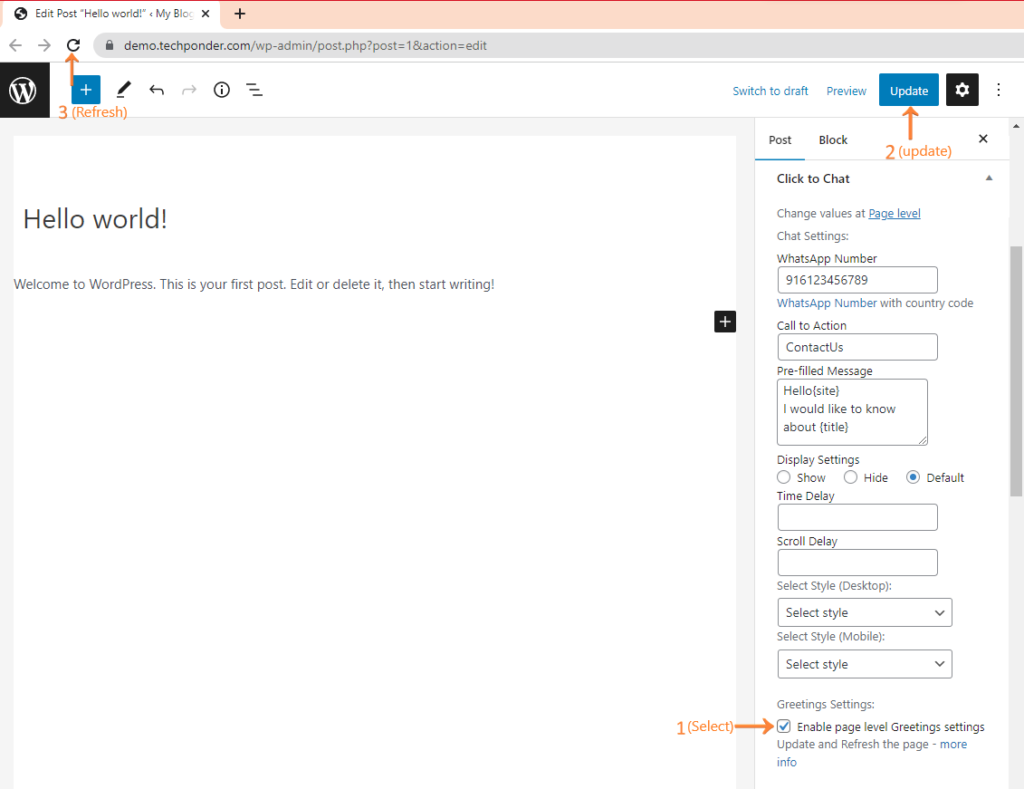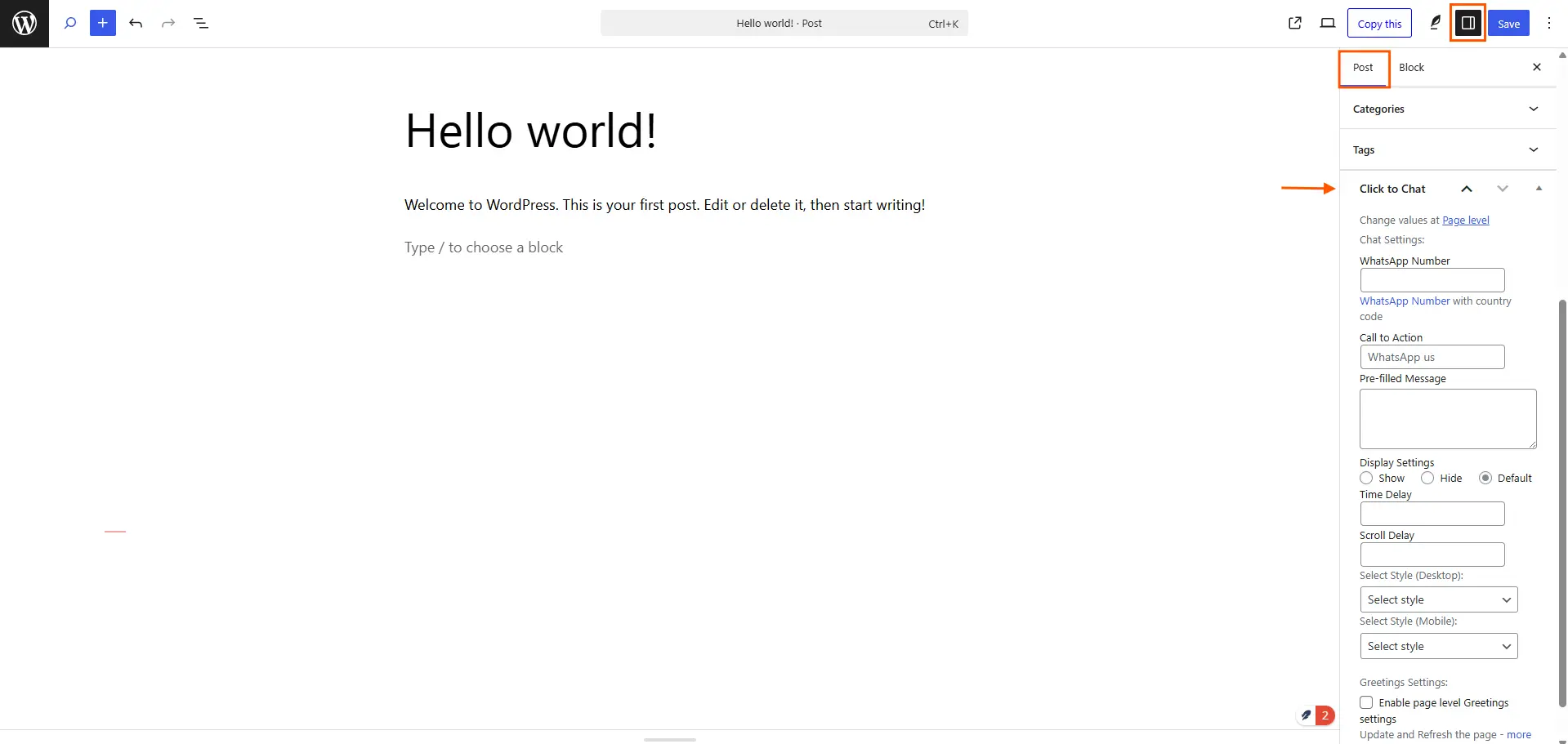 The Click to Chat plugin allows us to display customized greeting messages on individual pages or posts. To achieve this, we can enable the Page-Level Greetings feature, which provides separate settings and templates for each post or page.