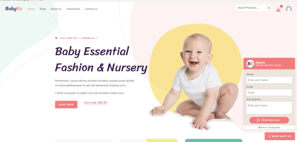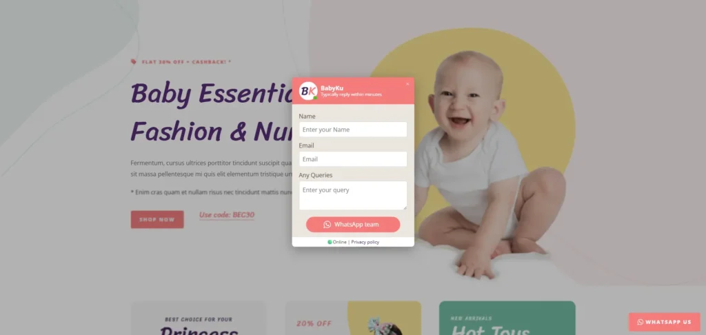 This placement keeps the greeting dialog directly connected to the WhatsApp button. It’s compact, accessible, and feels like a natural extension of the chat trigger.
