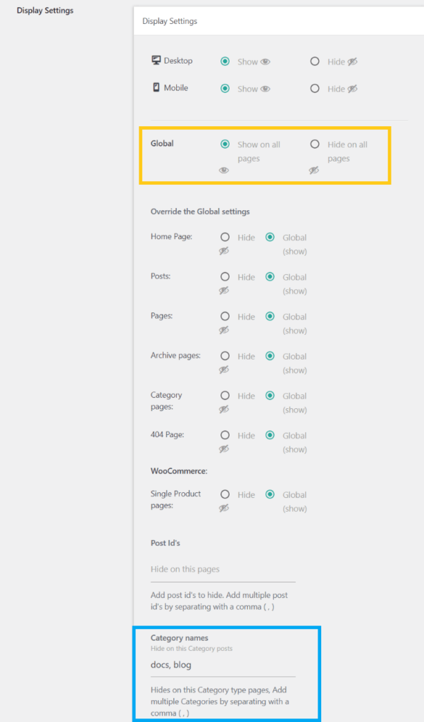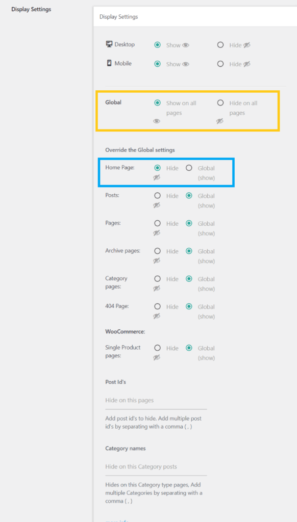 We can control where the chat widget appear by configuring the Display Settings and Override Settings in the plugin. Below are the different methods we can use to hide styles on specific pages, posts, categories, or even device types.