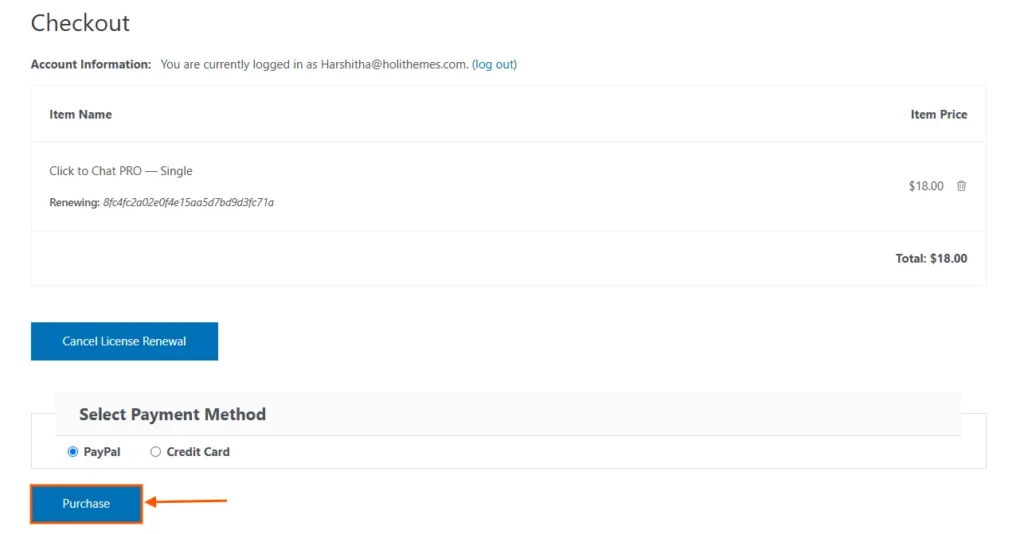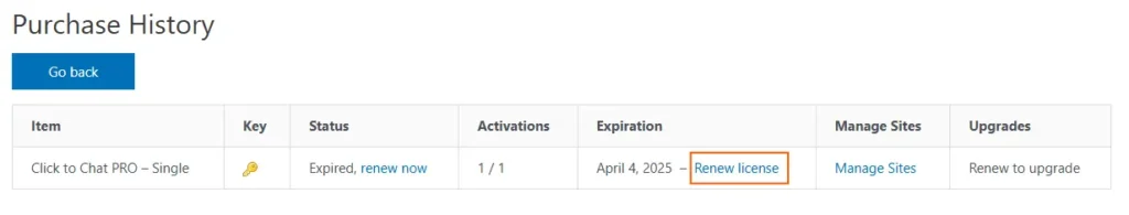 - Find the license you wish to renew from the list of purchases.