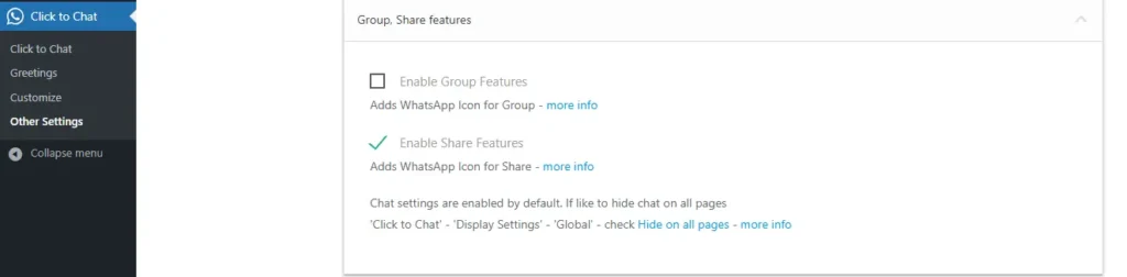 To enable Share chat feature check/tick the enable share feature in “Click to Chat” –>“Other settings” and scroll to –> “Enable Share Feature”