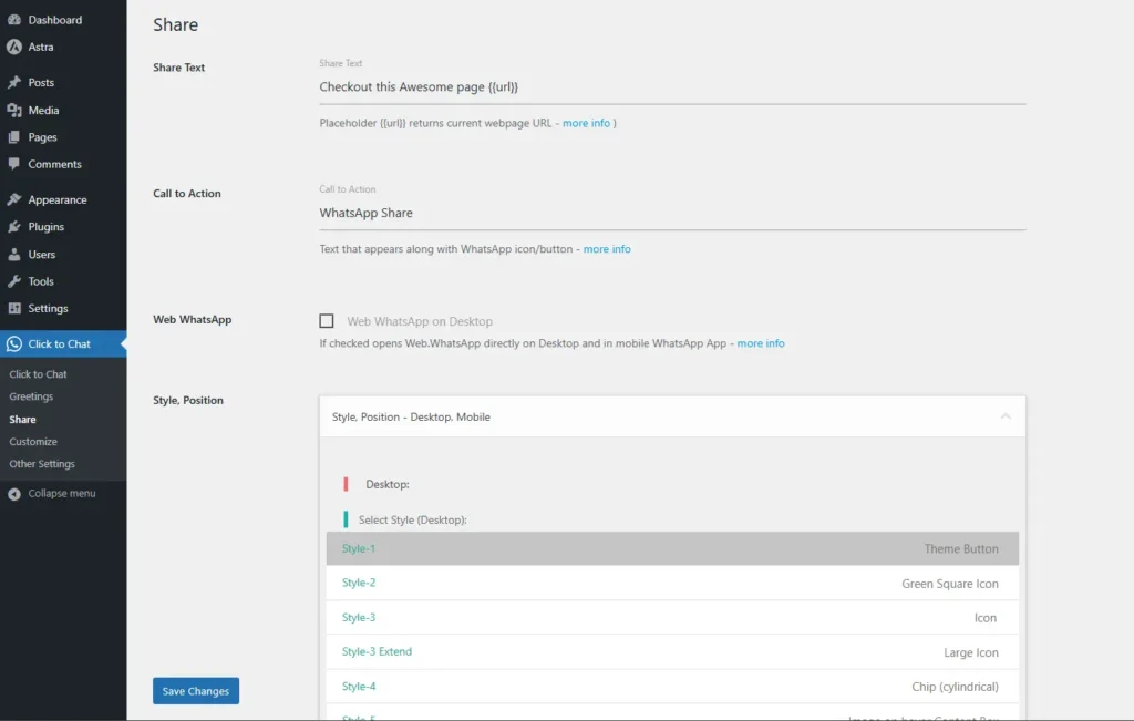 Here, you can customize the share text, call-to-action, and choose styles (WhatsApp button/image) based on the device. Additionally, you can position the style at a fixed location on the screen and hide/show the icon or styles as needed.