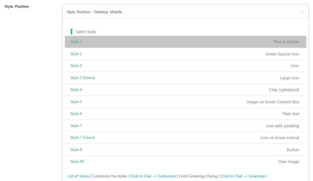 Navigate to Click to Chat – Style, Position, Select Style 1, and click Save.