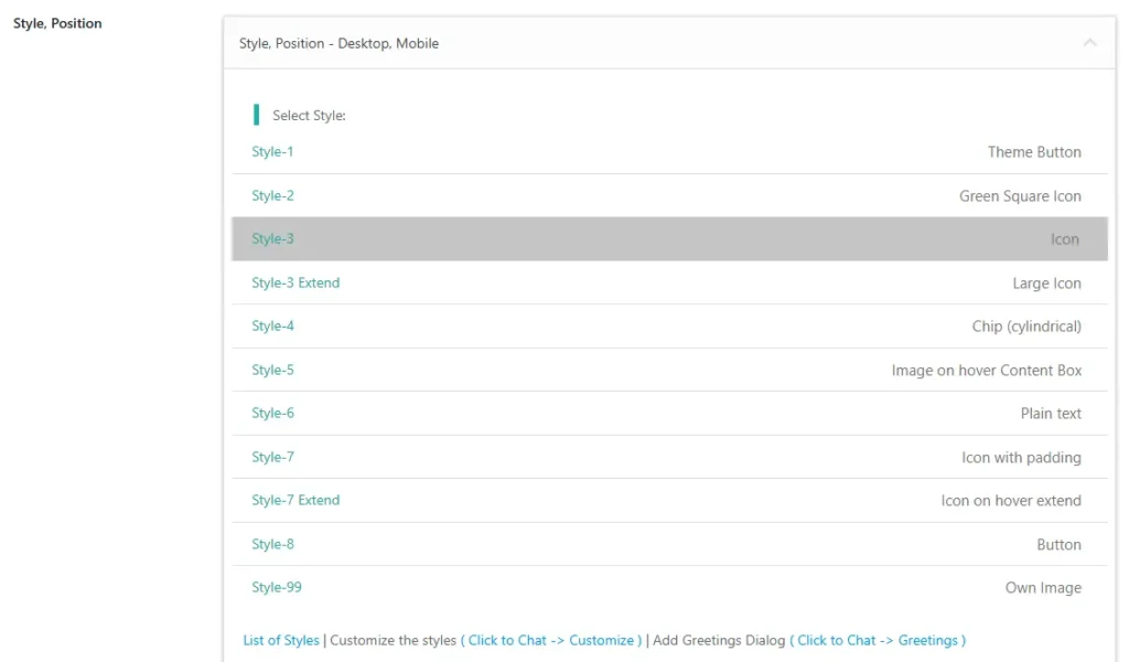 Navigate to Click to Chat – Style, Position, Select Style 3, and click Save.