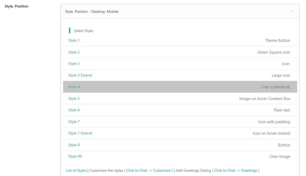 Navigate to Click to Chat – Style, Position, Select Style 4, and click Save.