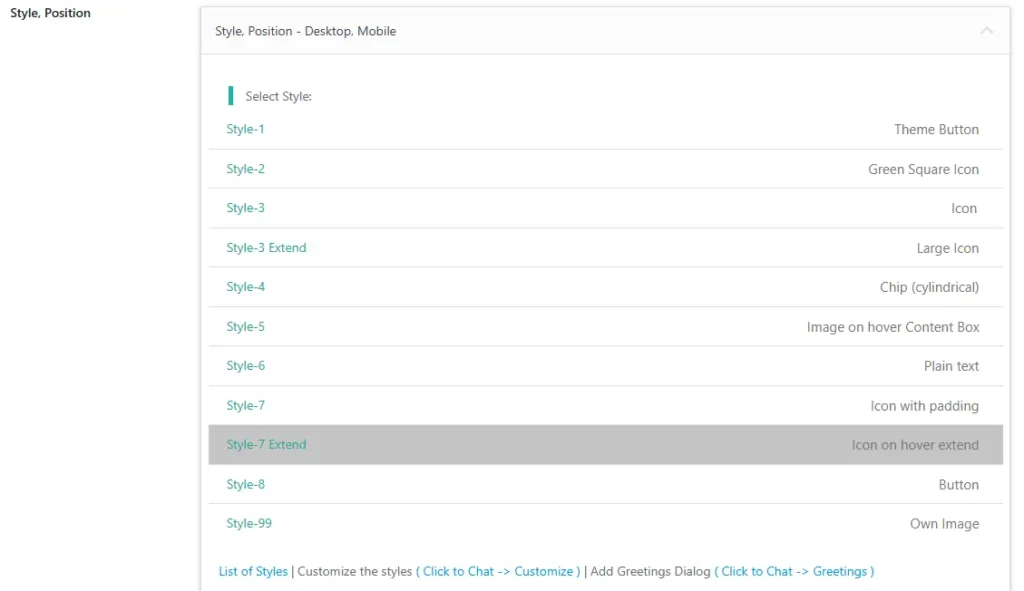 Navigate to Click to Chat – Style, Position, Select Style 7 Extend, and click Save.