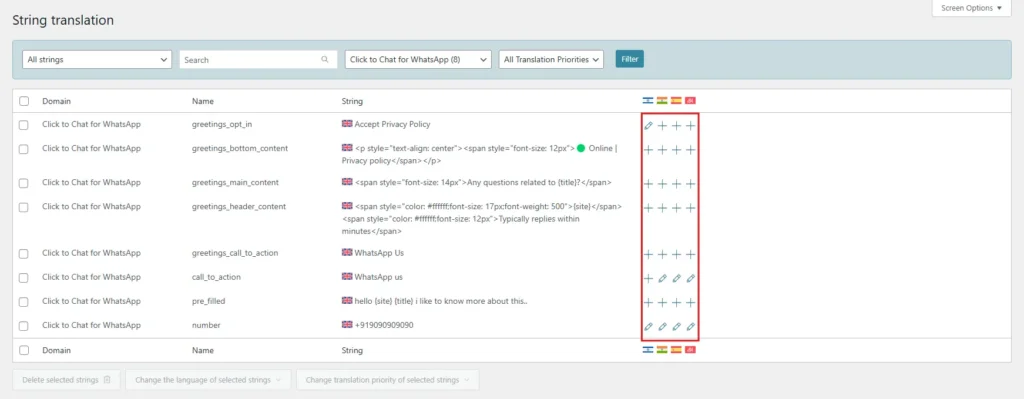 If the Click to Chat for WhatsApp strings are not visible in the String Translation page: