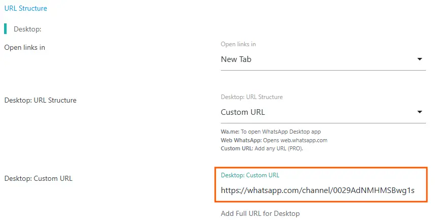 Using the Custom URL feature in the Click to Chat plugin, we can easily add a link to our WhatsApp Channel instead of the default WhatsApp number.