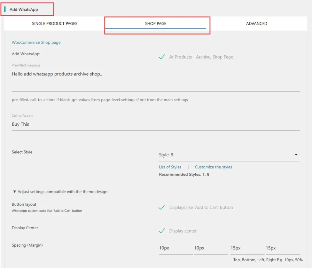 Navigate to ”Click to Chat” -> ”WooCommerce” – “Add WhatsApp – SHOP PAGE