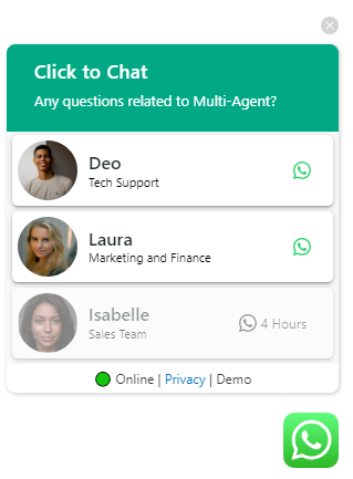 When visitors click the WhatsApp icon or button, a number is randomly selected from a predefined list configured in the admin settings..